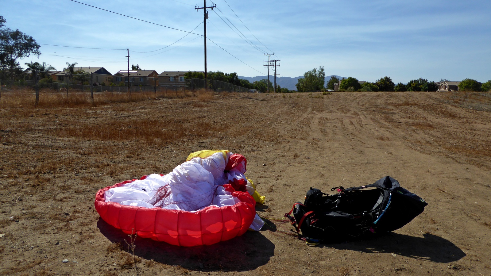 I flew from Lake Elsinore to past Corona before, but this time idea was to do out and return and maybe try to shoot toward Soboba. Dmitry was up for a challenge and we had an excellent flight to south Corona and back. We could probably fly all the way to the end of the mountain ridge, but commercial airplanes traffic was so bad we decided to play it safe and turn around early. Well, not early enough to have a chance for Soboba leg, since sea breeze already arrived when we returned to Elsinore. Dmitry laded on the lake shore and I attempted to cross the lake and establish on the other side, but that did not quite work out. I landed maybe 10 miles up near hw 74, but still managed to do a nice 57 km free triangle.